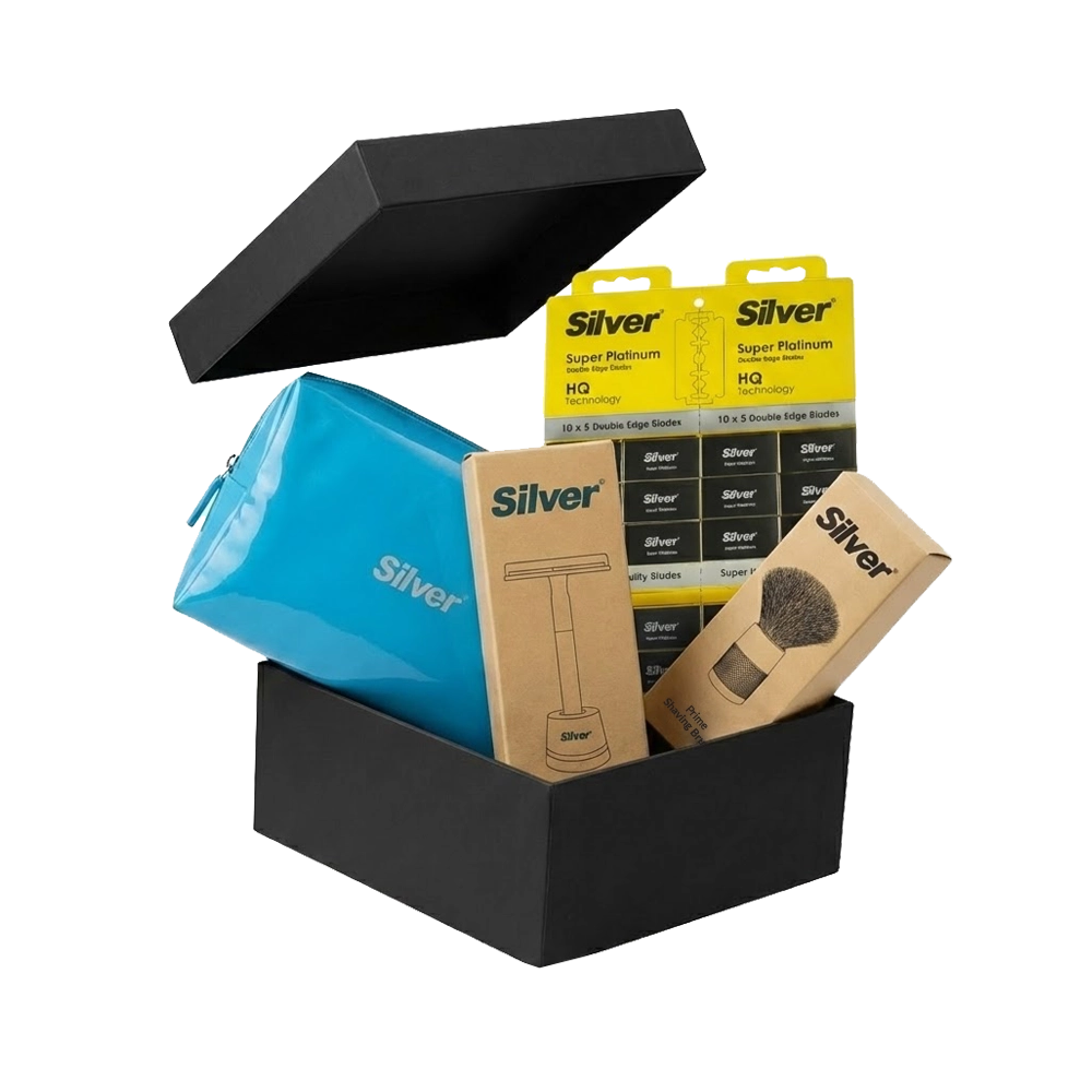 باکس نوستالژی روز مرد سیلور یک پک لوکس اصلاح کلاسیک شامل فرچه گورکن، خودتراش Safety Razor با پایه، تیغ سنتی دو لبه و کیف آرایشی است که در باکسی محکم و شکیل ارائه می‌شود و گزینه‌ای ماندگار و ارزشمند برای هدیه روز مرد محسوب می‌شود.